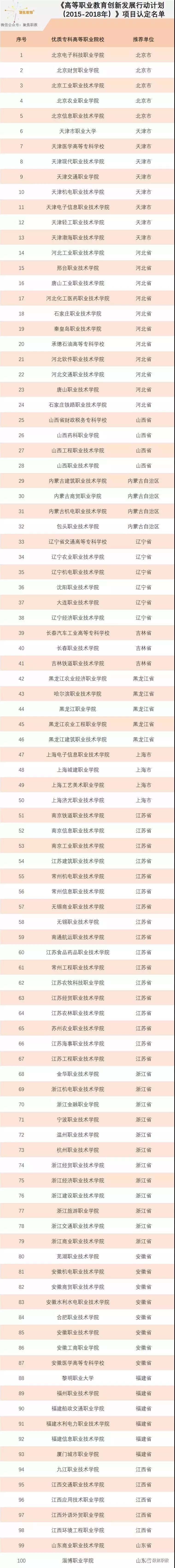 近日,教育部职业教育与成人教育司发布了“关于《高等职业教育创新发展行动计划(2015-2018年)》项目认定名单的公示”。