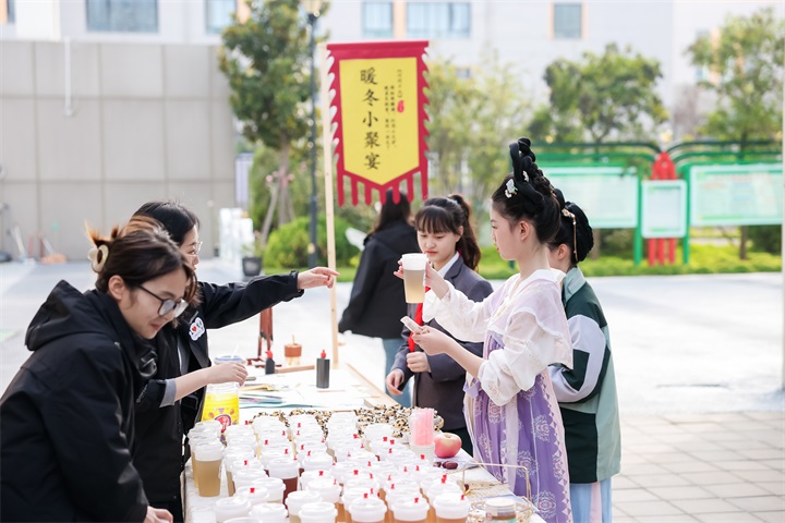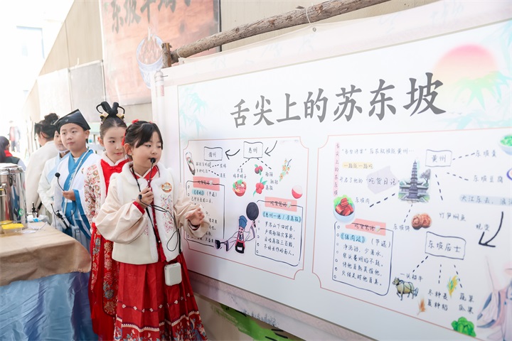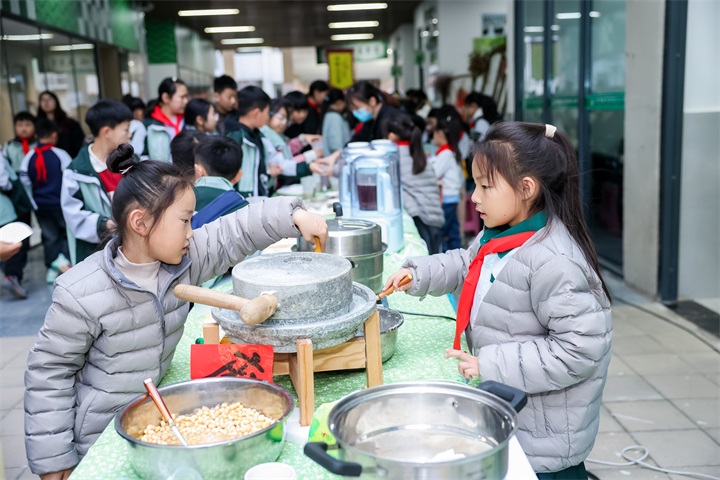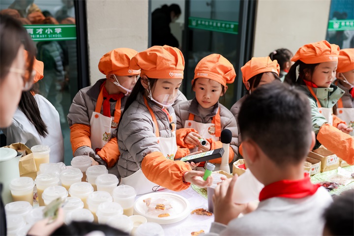 本次活动严格遵循河南省教育厅《河南省中小学幼儿园食育指南》“依食而养,借食而育” 的核心理念,创新打造 “沉浸式剧本场景” 校园 —— 公益力量不仅为活动提供了智能豆浆机等科技设备支持,更带来专业食育资源,让传统与现代的碰撞、知识与实践的融合更具落地性。活动以 “筷子” 为串联线索,以 “诗人与名宴” 为文化内核,各年级化身专属 “诗人团队”,围绕不同主题开展特色活动:一年级白居易 “暖冬小聚宴” 上,学子围炉煮茶体悟 “晚来天欲雪,能饮一杯无” 的分享之乐;二年级王维 “山水田园宴” 中,石磨豆浆的传统技艺与公益支持的智能豆浆机形成跨时空碰撞,孩子们在亲手操作中既感受古法智慧,也体验科技便捷;五年级李白 “诗仙欢庆宴” 上,借助公益提供的食育教具,膳食宝塔搭建让营养知识直观可感;六年级《诗经》“鹿鸣谢师宴” 里,雅乐奉茶传递感恩之情。诗词飞花令、机器狗运蔬菜等环节,更让同学们在互动中感受中华饮食文化的千年底蕴与智能科技的独特魅力,实现了饮食与礼仪、劳动、科技的有机融合。